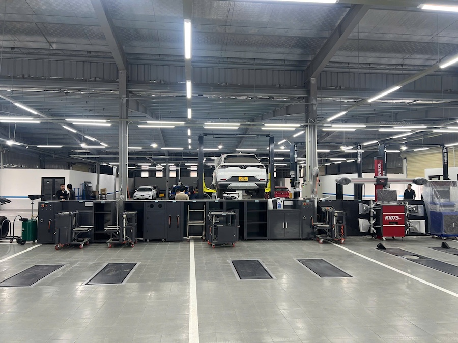 Xưởng kỹ thuật sở hữu đầy đủ các trang thiết bị hiện đại: máy chuẩn đoán lỗi, cầu nâng, hệ thống kiểm tra điện cao áp dành riêng cho xe điện VinFast.